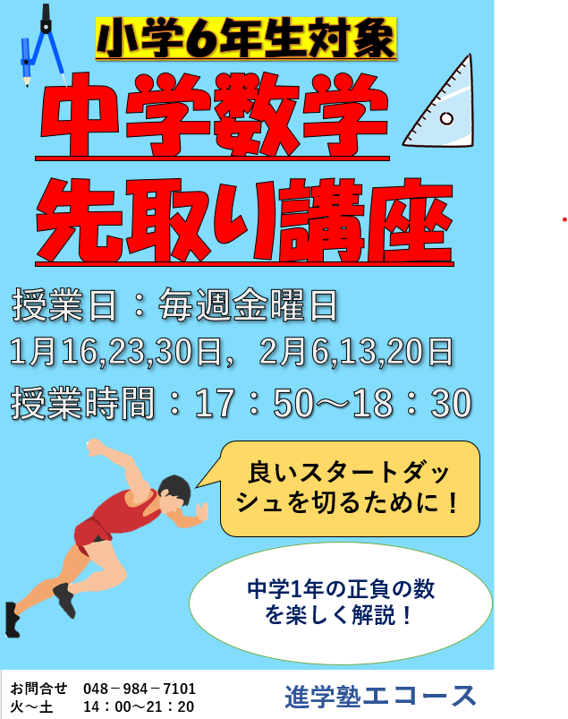進学塾エコースでは例年2月から数学と英語の中学準備講座を実施しておりましたが、多くの生徒が躓く数学に限り、今年度は1月から始め、より多くの時間を使い、基本がしっかりと定着した状態で進学ができるようサポートさせていただきます。